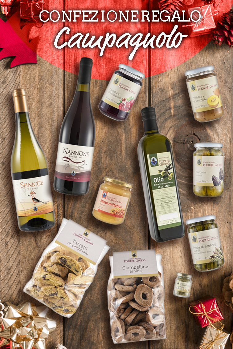 1 Olio Extravergine d'oliva 0,75 1 Carciofino sott'olio 320 gr 1 Asparago sott'olio 320 gr 1 Vino rosso igt Nannone 0,75 1 Vino Bianco frizzante Spinicce 0,75 1 Marmellata di melograno 320 gr 1 Marmellata di kiwi Giallo 320gr 1 Miele mille fiori 500 gr 1 finocchietto selvatico da 20 gr 1 Confezione di Ciambellina al Vino da 400 gr 1 Confezione di Biscotto tozzetto al cioccolato da 500 gr 1 Confezione Regalo (scatola di cartone) 1 Bigliettino personalizzato